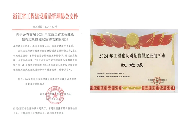 在2024年度工程建設質量信得過班組比賽中,我公司水東樞紐項目團隊獲得浙江省建設成果取得顯著成績班組和中國施工企業(yè)管理協(xié)會《2024年度工程建設質量信得過班組改進級》。