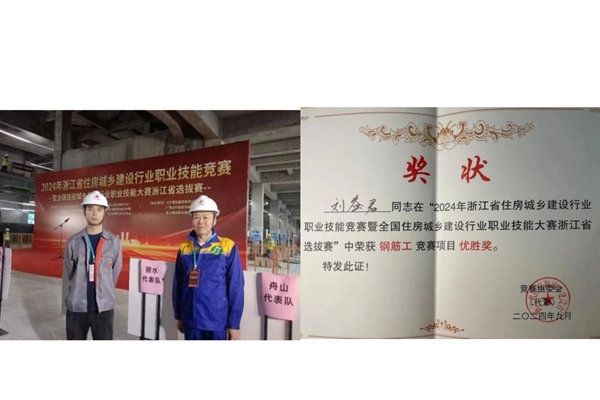 公司員工劉益君參加2024年浙江省住房城鄉(xiāng)建設行業(yè)職業(yè)技能競賽暨全國住房城鄉(xiāng)建設行業(yè)職業(yè)技能大賽中,榮獲“鋼筋工競賽項目優(yōu)勝獎”。