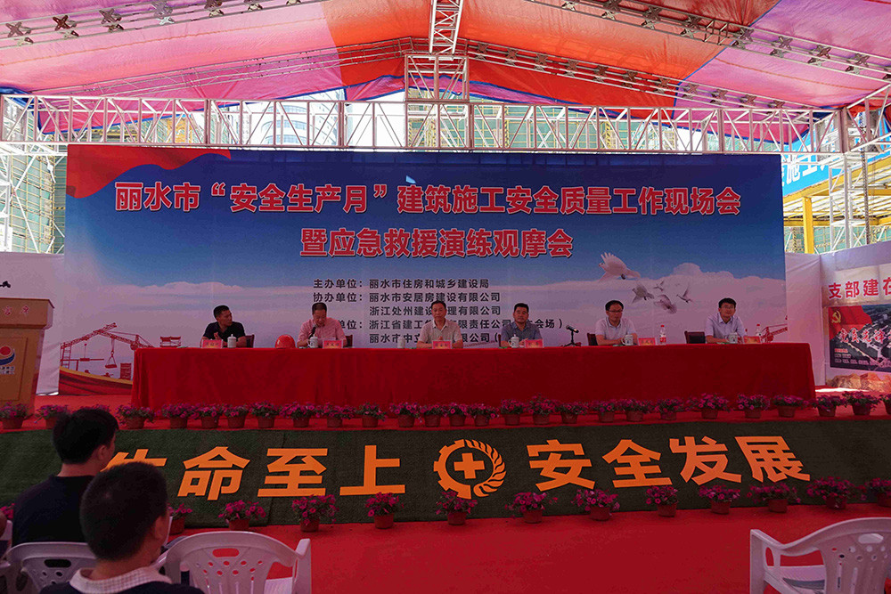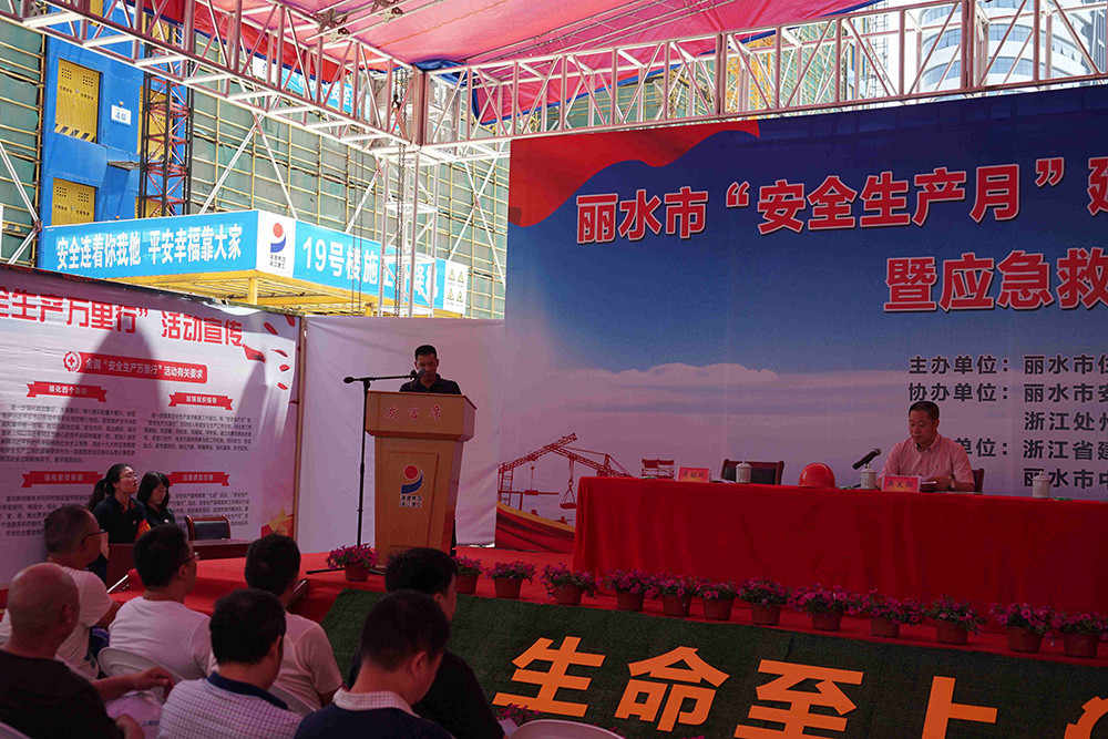 6月15日上午,麗水市住房和城鄉(xiāng)建設(shè)局召開麗水市“安全生產(chǎn)月”建筑施工安全質(zhì)量工作現(xiàn)場會暨應(yīng)急救援演練觀摩會,我公司承建的麗水市人民醫(yī)院東城院區(qū)項(xiàng)目部為本次會議的觀摩現(xiàn)場、公司副總經(jīng)理吳韶斌代表施工單位在大會上作交流發(fā)言。